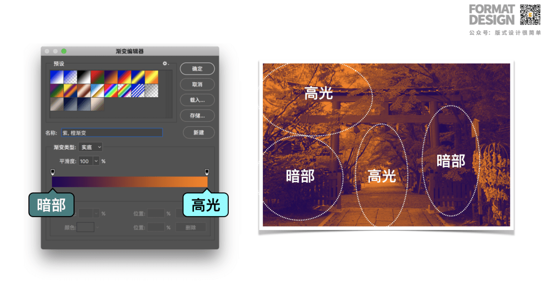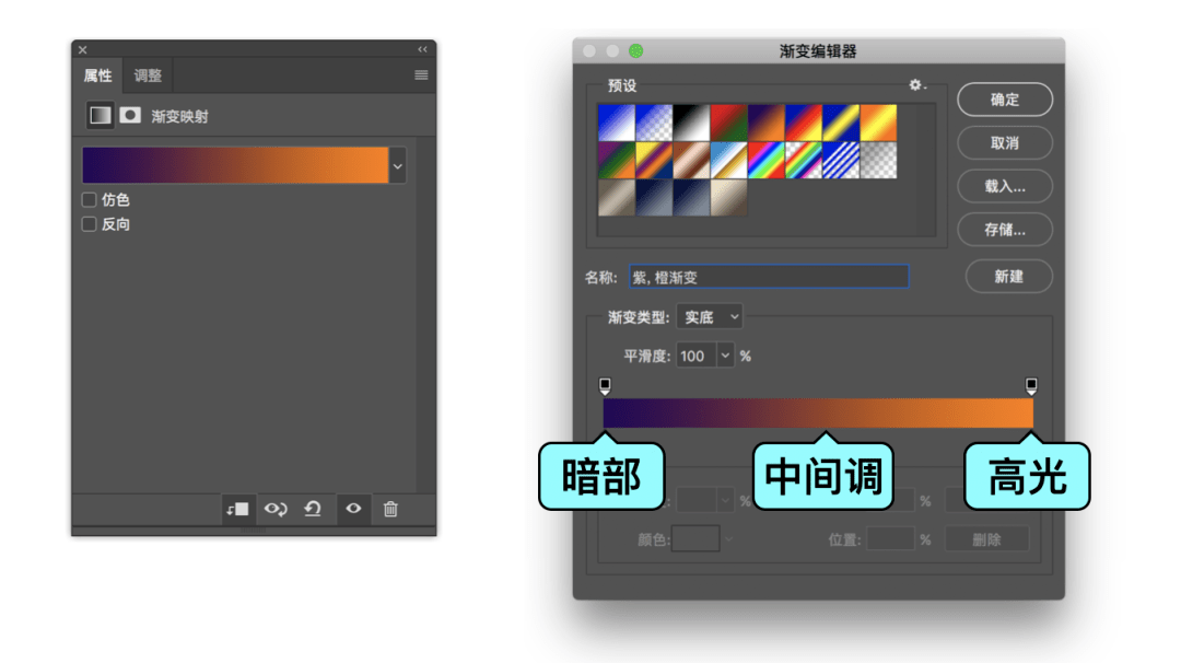 在渐变映射中有一个颜色渐变条,这个颜色渐变条从左到右对应的就是照片暗部、中间调和高光区域。