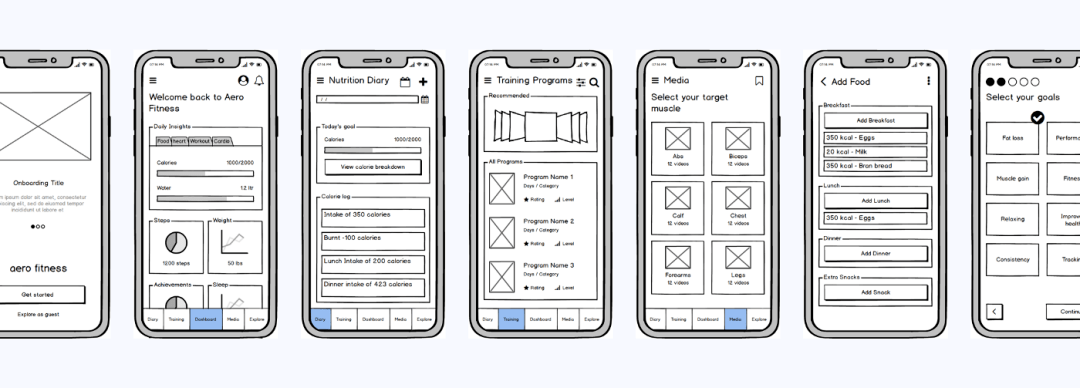 从草图到线框逐步推进,描述应用的流程和定义应用功能的元素的逻辑结构。每个用例都被快速原型化为线框,这样我们就可以理解流程,并最终定义产品的信息架构。