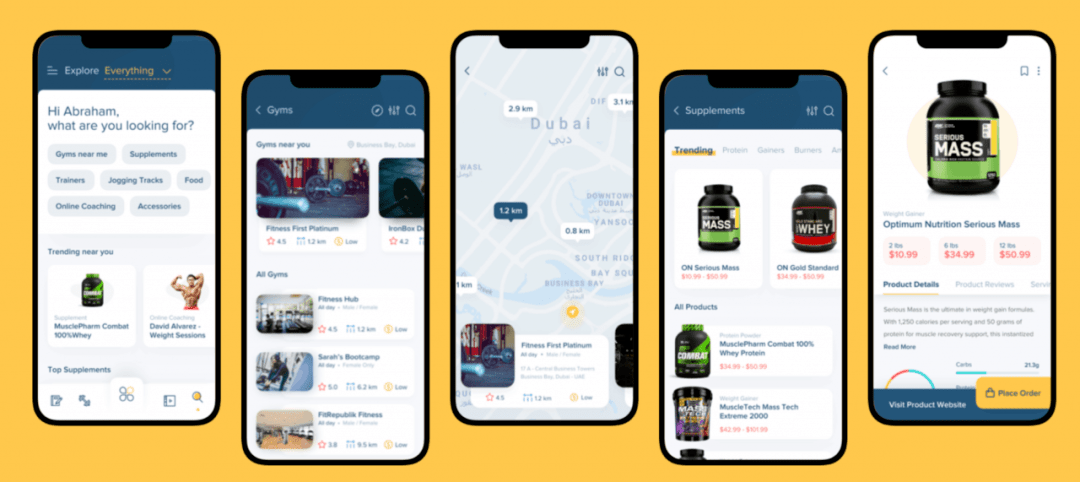 用户可以轻松搜索到任何他们需要的东西,包括正品补品、教练、附近的健身房、赛道、教练,甚至是健身房配件。