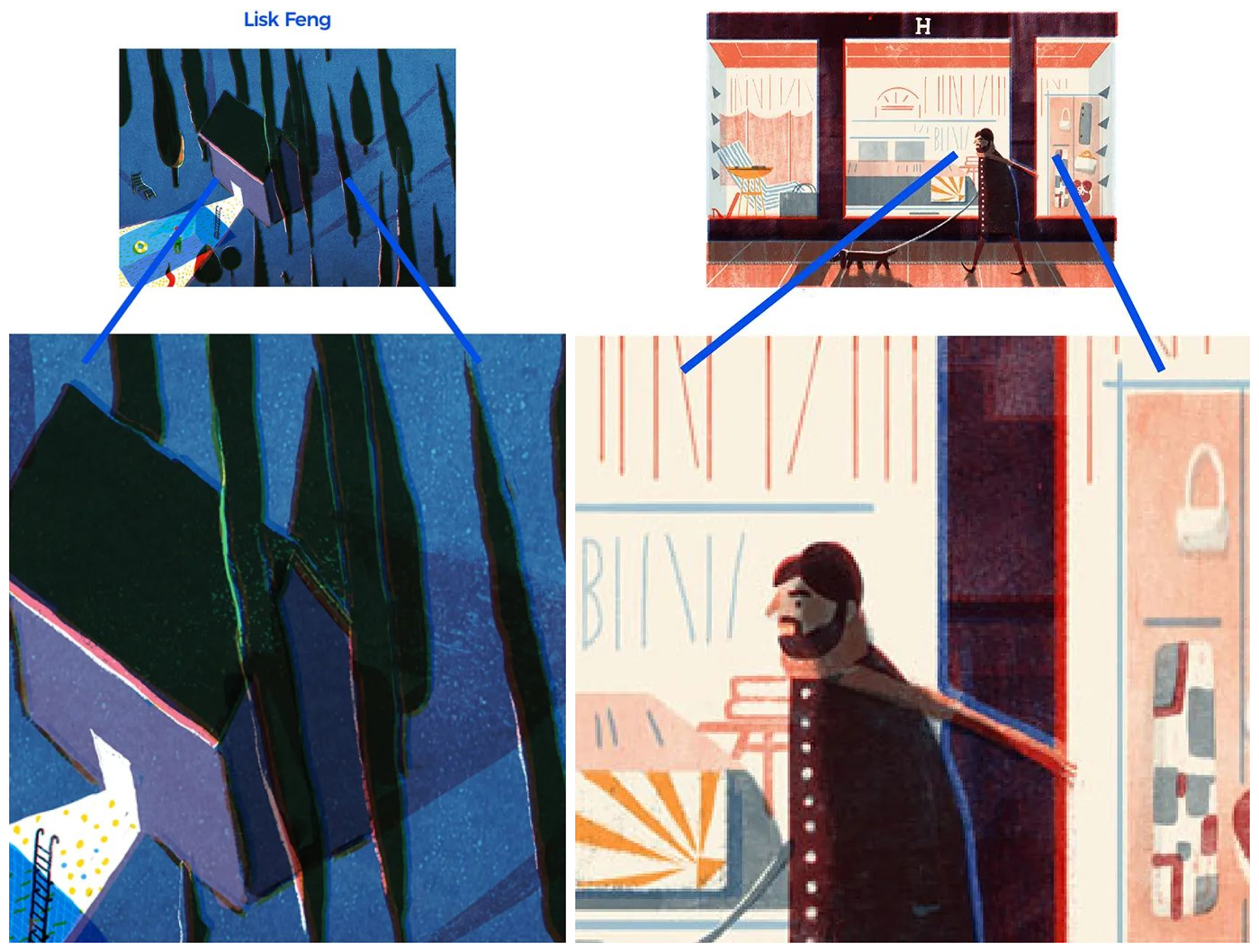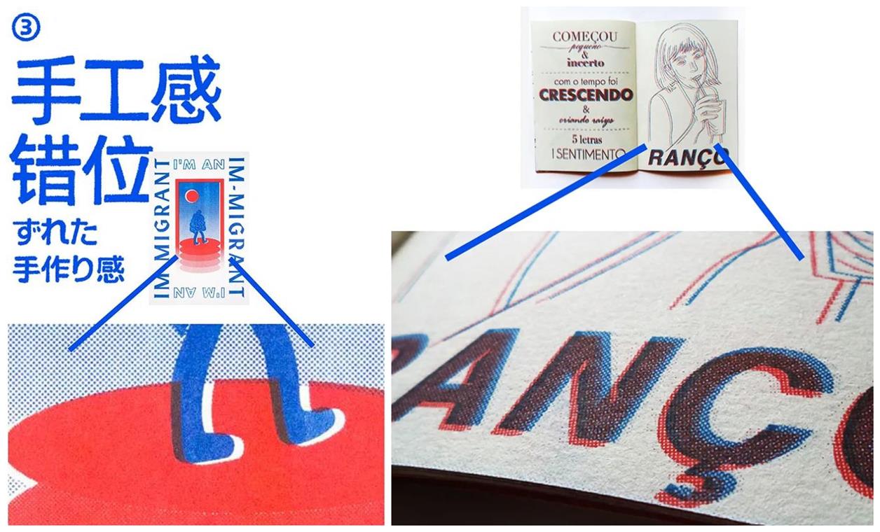 第三个特点是具有手工感的错位。riso套色没有这么准确,与颜色叠加的特点的结合,让画面产生一种不确定性,而这种错位的效果也为画面增加了细节。