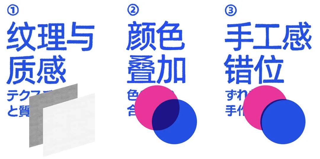 不知道大家有没有发现,其实这些质感都是可以在完成图稿后添加的。比如说纹理与质感可以通过纸纹得到、颜色的叠加可以通过改变图层样式处理、错位的特点也可以通过移动色块来实现。