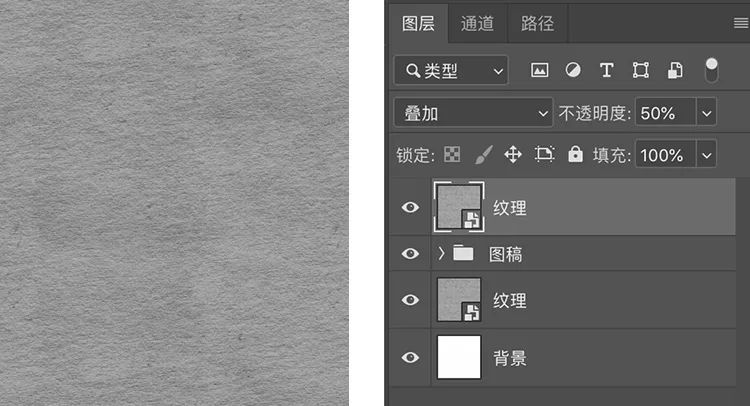 △ 最后增加riso印刷的质感,就是纸质感和网点纹理。按照图示,把纸纹分别添加在插图组的上下方。上方的纸纹混合模式为「叠加」,透明度为50%。下方的图层混合模式为「正片叠底」,透明度为15%。