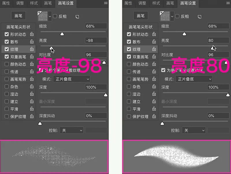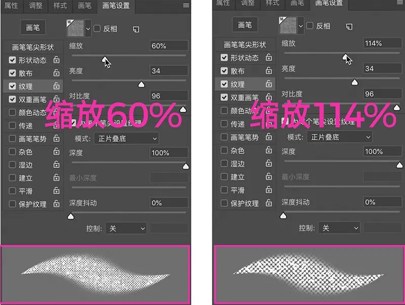 △ PS的纹理笔刷没办法通过压感控制纹理的轻重,所以只能通过调节「纹理」设置里的亮度和缩放。缩放就是调整纹理的大小。