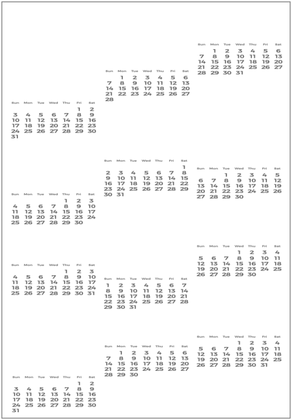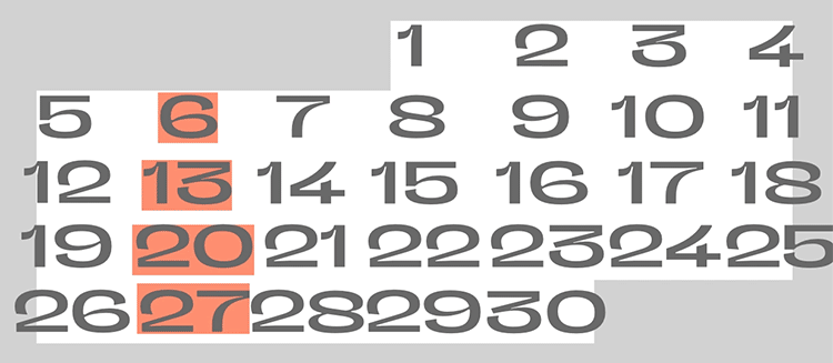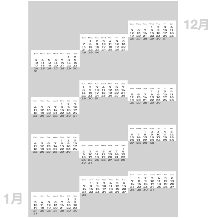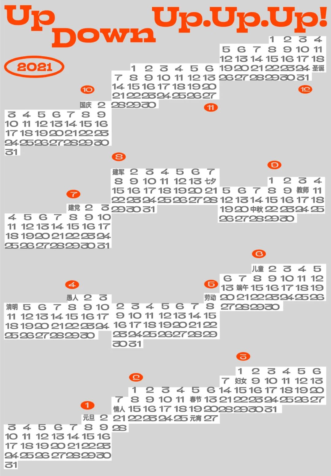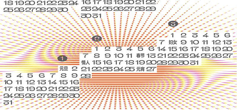 但是日历不同于其他文案有比较多的文字层级,每个日期都是平等的。做不好就很像表格,这就加大了编排的难度。既然文字内部的变化很难做,那么就要考虑文字之外的对比。不如让文字的组块更有节奏感。