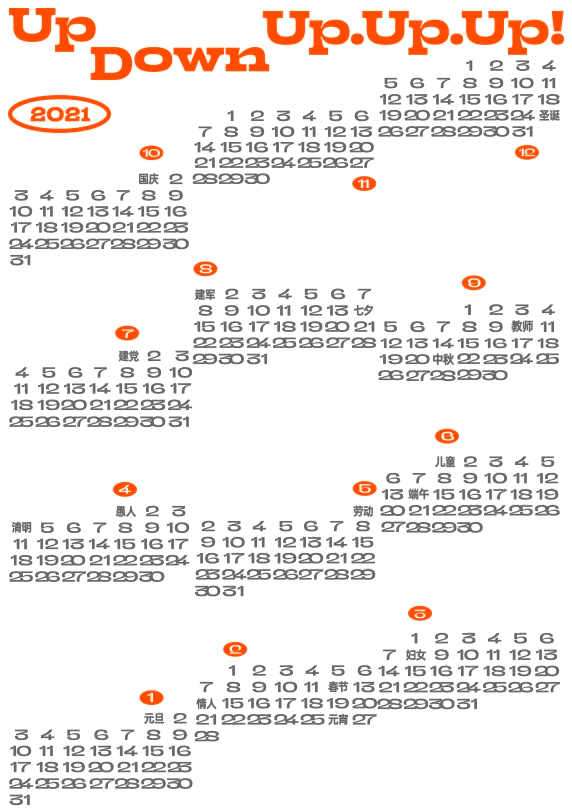 那么使用的是它的英文:up down up.up.up!把它放置在最上方,加上2021的小图标。大致的架构已经完成,先调整一下除了背景之外的其他细节。