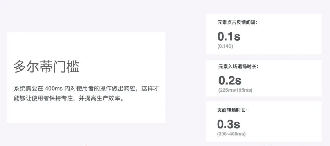 多尔蒂门槛告诉我们:系统需要在 400ms 内对使用者的操作做出响应,这样才能够让使用者保持专注,并提高生产效率。
