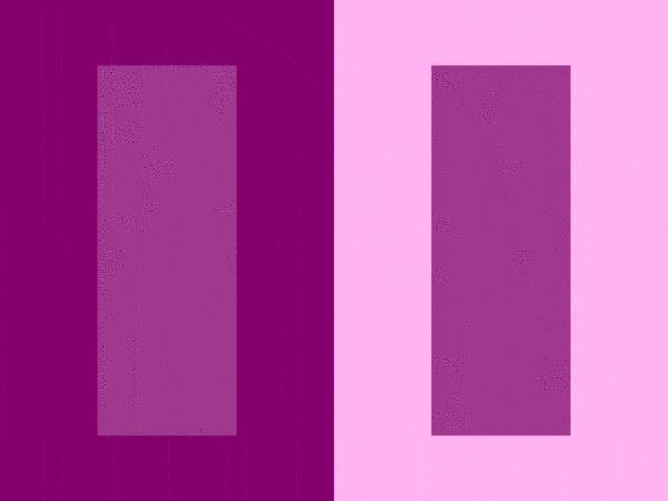这个错觉相当细微,却迷人无比。看上图,左侧的紫色块看起来比右边的明度要高一些。但是合并之后,两侧的色块其实明度是完全一致的。