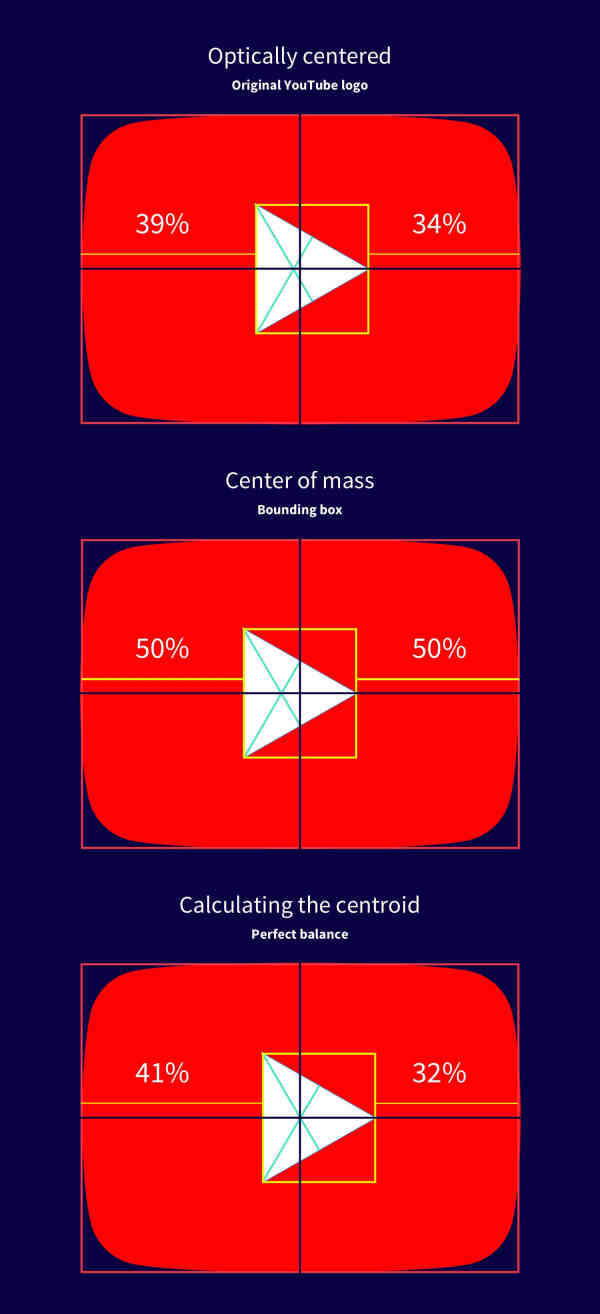 将一个三角形置于圆角/直角矩形边框中,可能会使它看起来居中位置不对。造成这个现象的原因被称为「三角形分割错觉」。三角形质心是基于最小外接矩形的。所以,如果你打算把一个点放到等边三角形高度一半的位置,你会发现它看起来要超过一半。