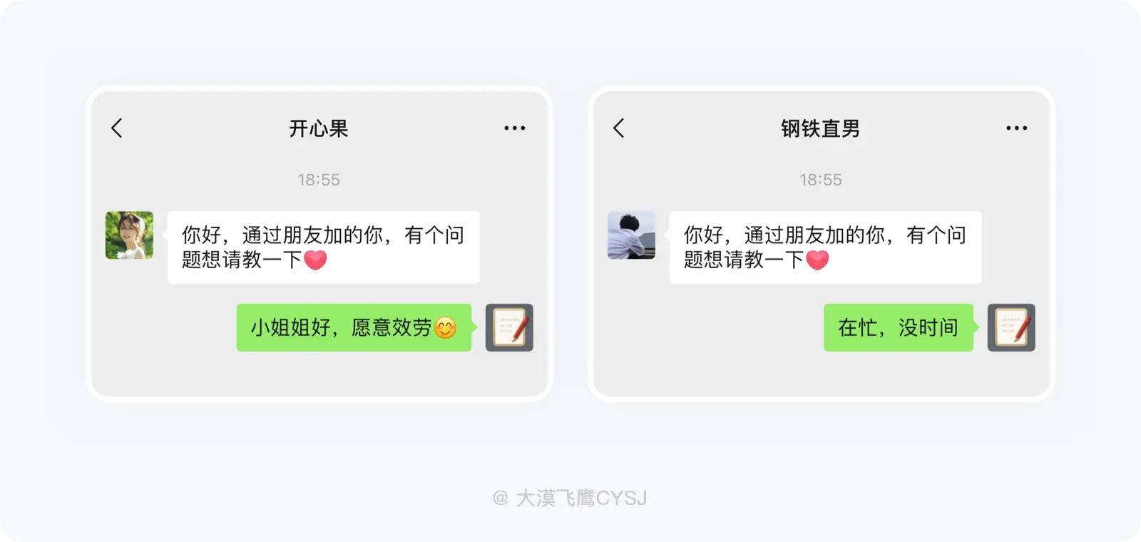 如果是一个单身男性,当社交应用中有人加好友或请教问题时,针对有美女头像的用户,其响应效率、质量都会比其他头像的用户要高,这是不争的事实(别杠,我们不谈个例),这也说明自己时刻都在注意在对方心中的形象,总担心被对方看“穿”。