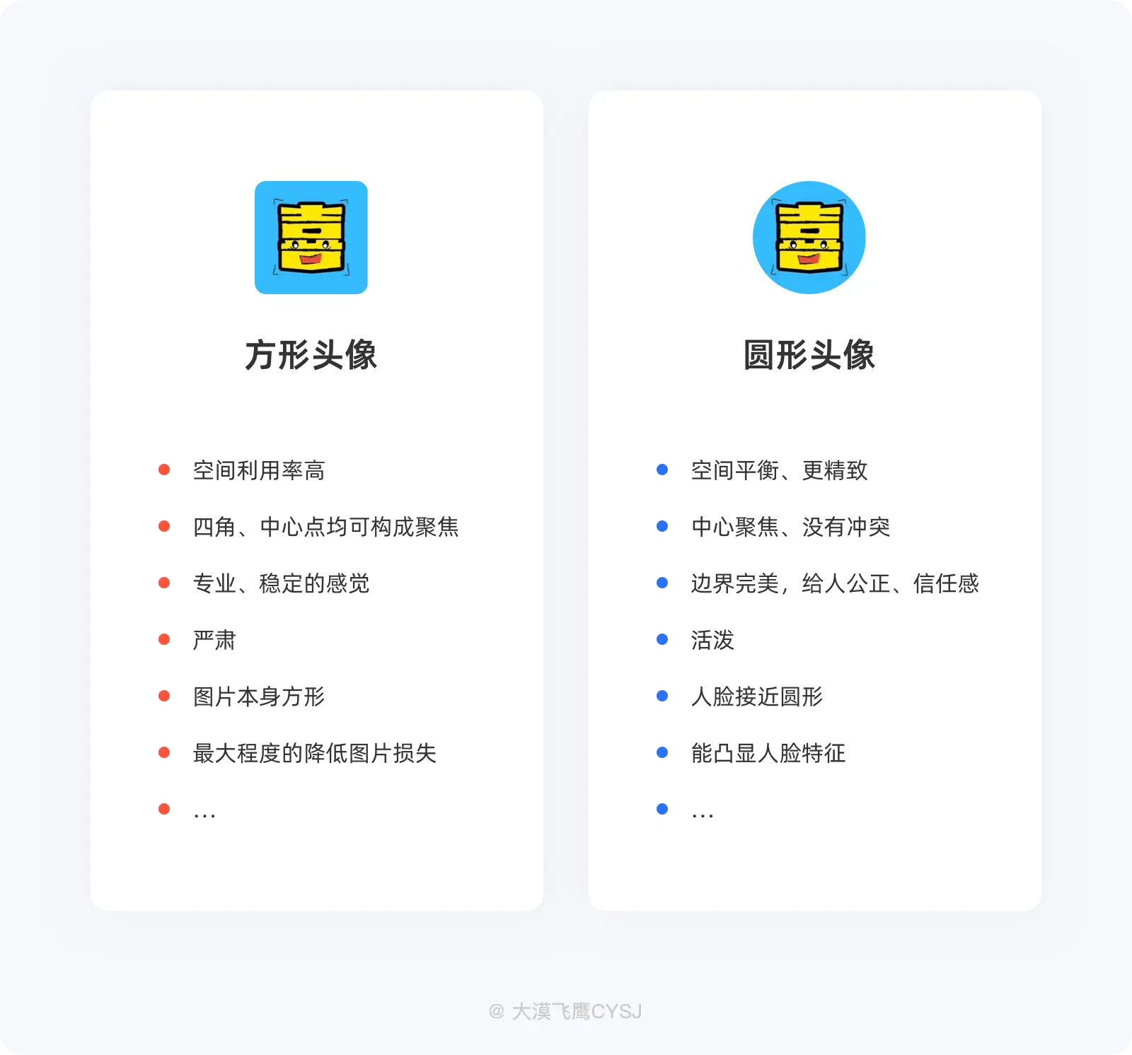 方形头像对照片的空间利用率更高、降低空间损失,圆形通过裁剪让空间更平衡、看起来更精致;