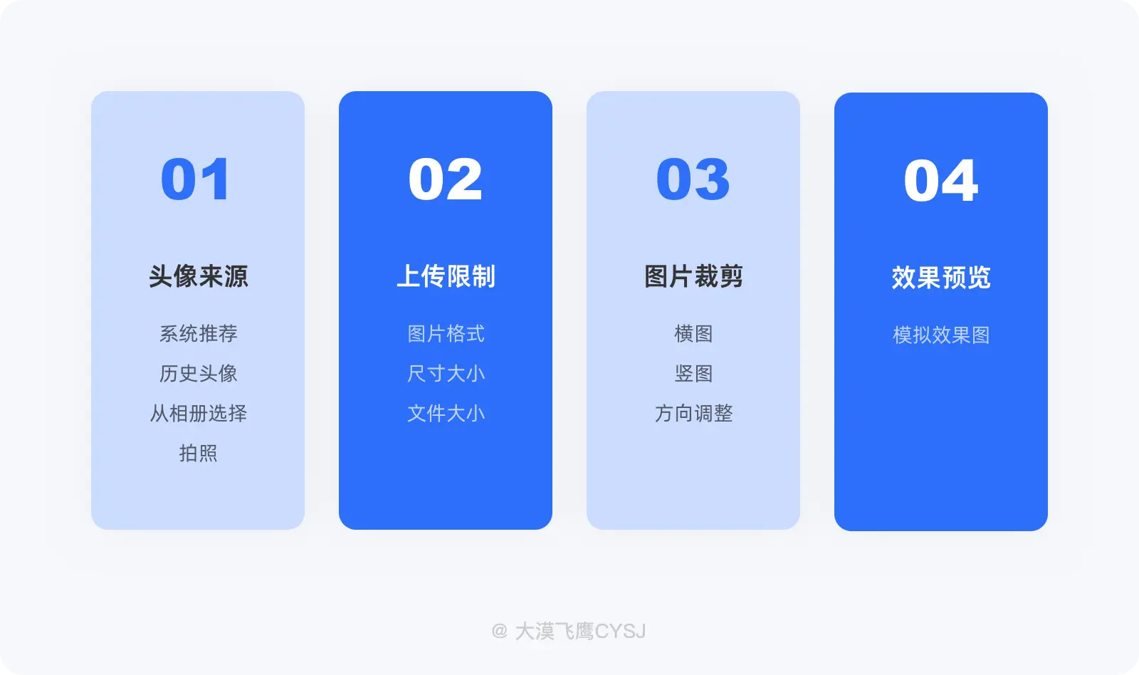 上传图片时,一般会对图片的格式(JPG/PNG/GIF等)、尺寸(宽*高)、文件大小(多少KB/M)作出限制,这些需要给予明确的提示,避免用户因操作多次失败而受挫离开,同时也能避免因用户不知道平台可使用GIF、视频等头像格式,而雪藏了产品的多元化服务。