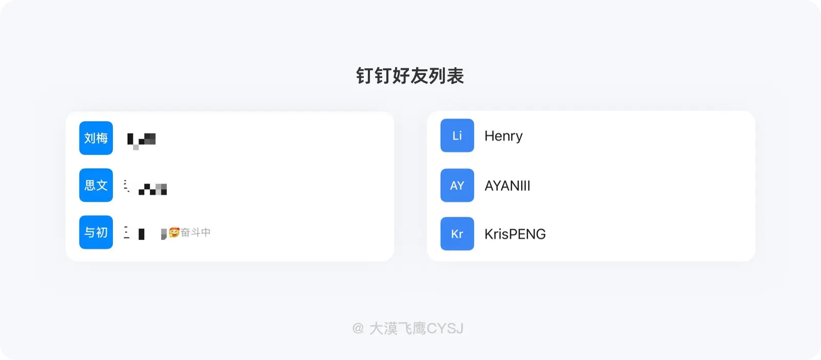 常出现在移动办公类应用中,由系统自动处理,基于OA类应用社交属性并不强,大多用于内部团队工作中的沟通交流,例如钉钉、纷享销客、飞书等。为了更清晰的获取对方个人信息,这类产品头像更倾向于上传自己的真实照片(部分企业强制),在用户未上传照片的情况下,系统会提取中文名字中的后两个字(两个字的全名显示)、英文名字前两个字母作为个人头像使用,方便团队成员更好的辨认。
