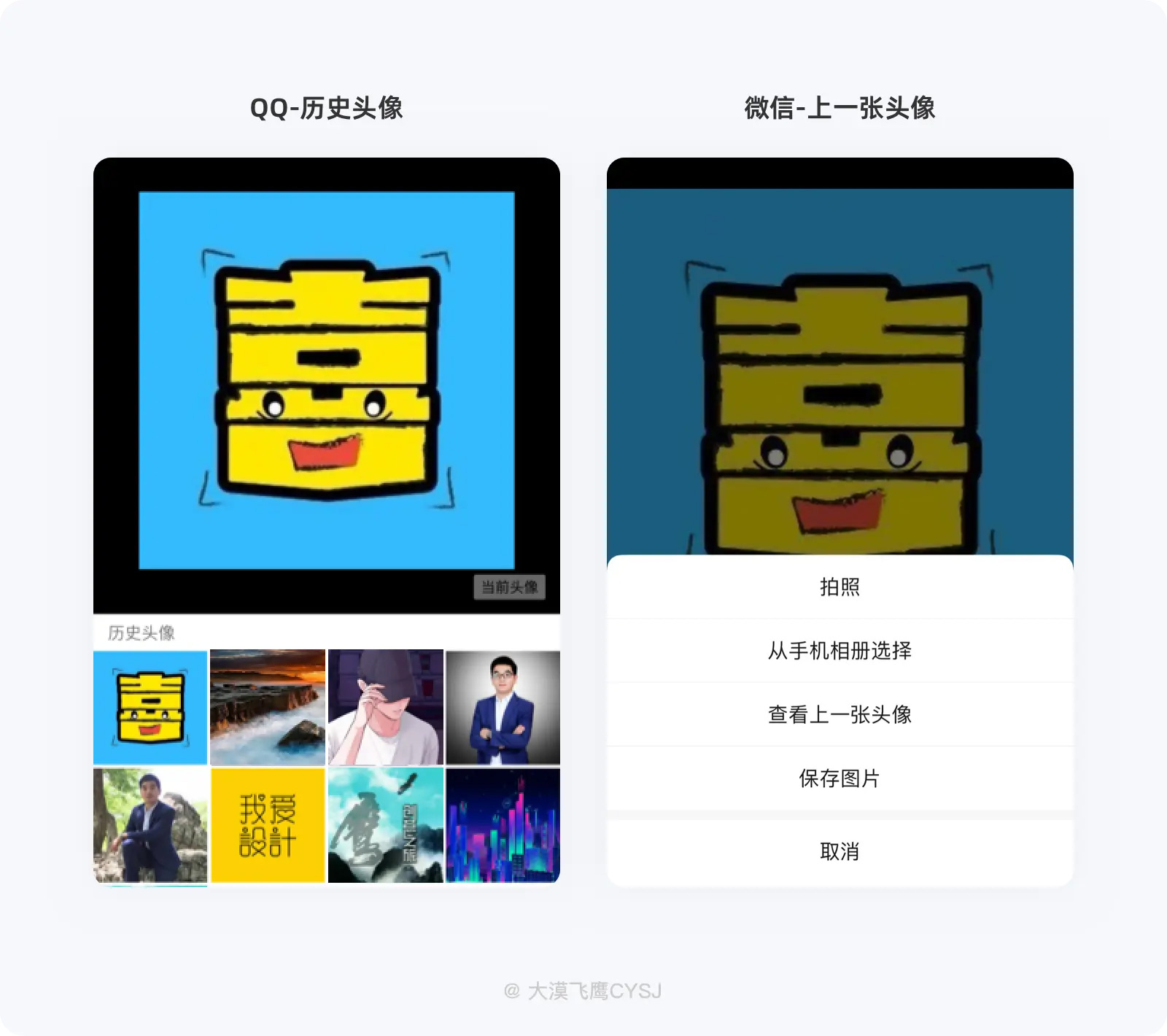 QQ会将用户之前使用过的头像搜集起来并单独提供一个入口,用户需要换头像时,可再次选择使用,虽然重新使用的几率并不高,但也不失为一种情怀,用户能清楚知道头像更换的历史轨迹,满满的回忆感。