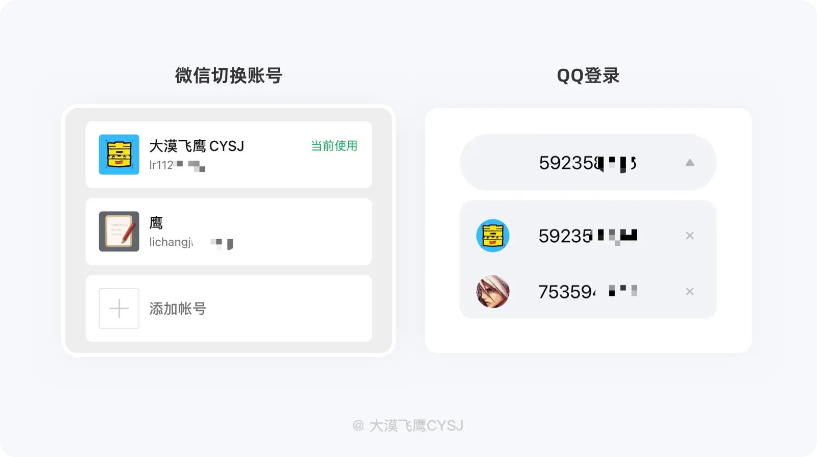 另外,如QQ登录、微信账号切换页面,也会利用突出的头像来快速区分账号信息。