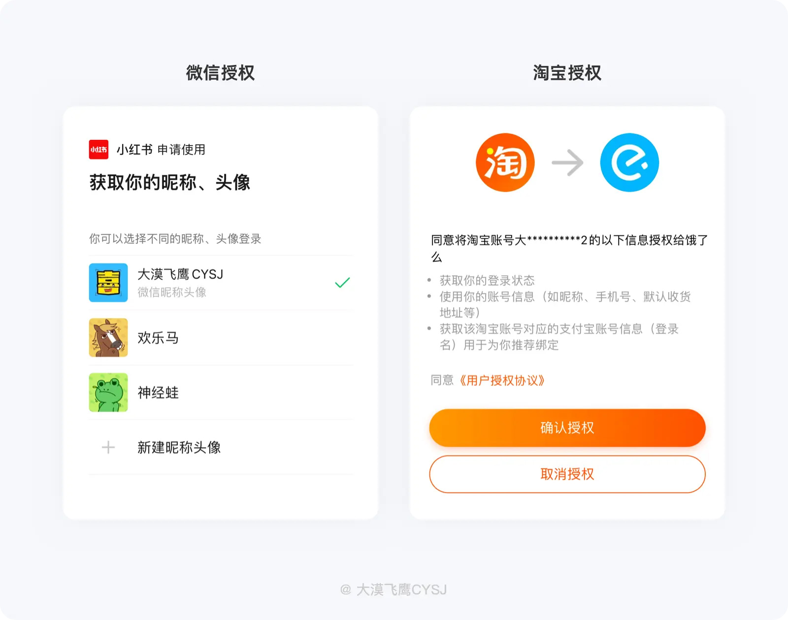 第三方登录的标配,用户无需重新编辑,就可以无差别继承第三方账号的头像、昵称等信息,节省了大量的时间及操作成本,例如微信、QQ、支付宝、微博授权登录等。