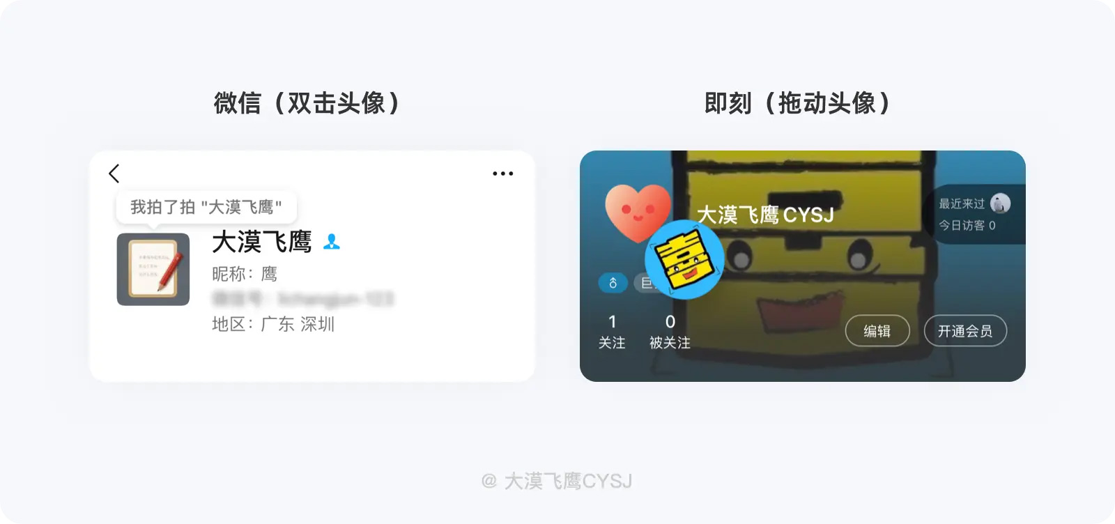 在很多应用中,个人中心页面的头像区域隐藏了设置功能,点击后会进入到个人主页、个人信息页或更换头像页面。还有一些无实际功能作用、纯趣味化的交互,例如双击微信好友的头像“拍一拍”、拖动即刻个人中心头像会出现一个红心等,不同程度的给用户制造意外惊喜。