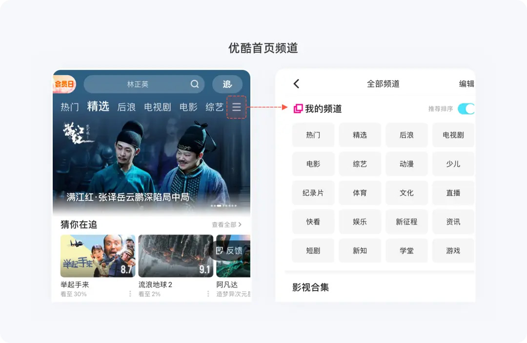 优酷APP首页将热门频道和点击频率较高的频道显示在顶部导航中,如精选、电视剧、电影、最新院线等,而其他更多的分类则隐藏在频道选项卡中,将少量(≈20%)重要的内容放在明显的位置,目的就是为了让大部分用户更快触达,提高了产品的易用性。