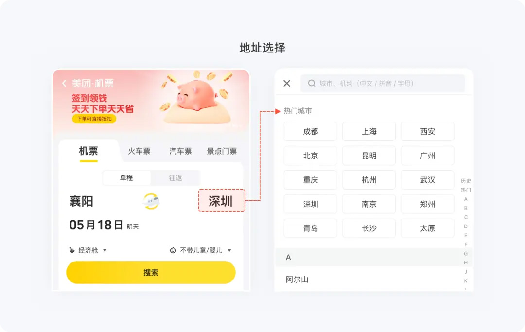 例如,使用美团购买火车票在选择地址时,面对超长的地址列表,逐个查看或通过字母筛选,都要花费一定的时间和操作成本,即便可以通过码字搜索来完成,但因为自行输入有很多的不可控性,能让用户选择的就不要让其输入。