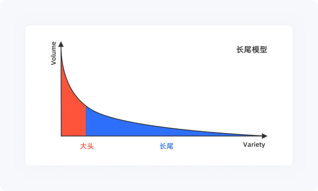 在2004年长尾模型才被提出来的时候,很多人认为这是在颠覆80/20法则,它们的曲线长得很像,但结论完全相反,那条长长的“尾巴”(非关键的80%)所占据的长度几乎与头部的(关键的20%)高度相当,这说明收益虽低,但这么多数量的累积,依然值得重点关注。