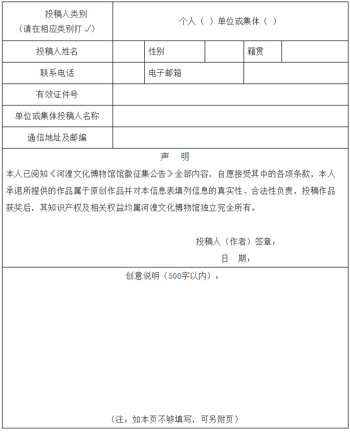 5、投稿人每人提交作品不超过3件,每件作品分别在对应的《河湟文化博物馆馆徽征集投稿信息表》(以下简称投稿信息表,见附件)中填写作者信息及500字以内的好创意说明。