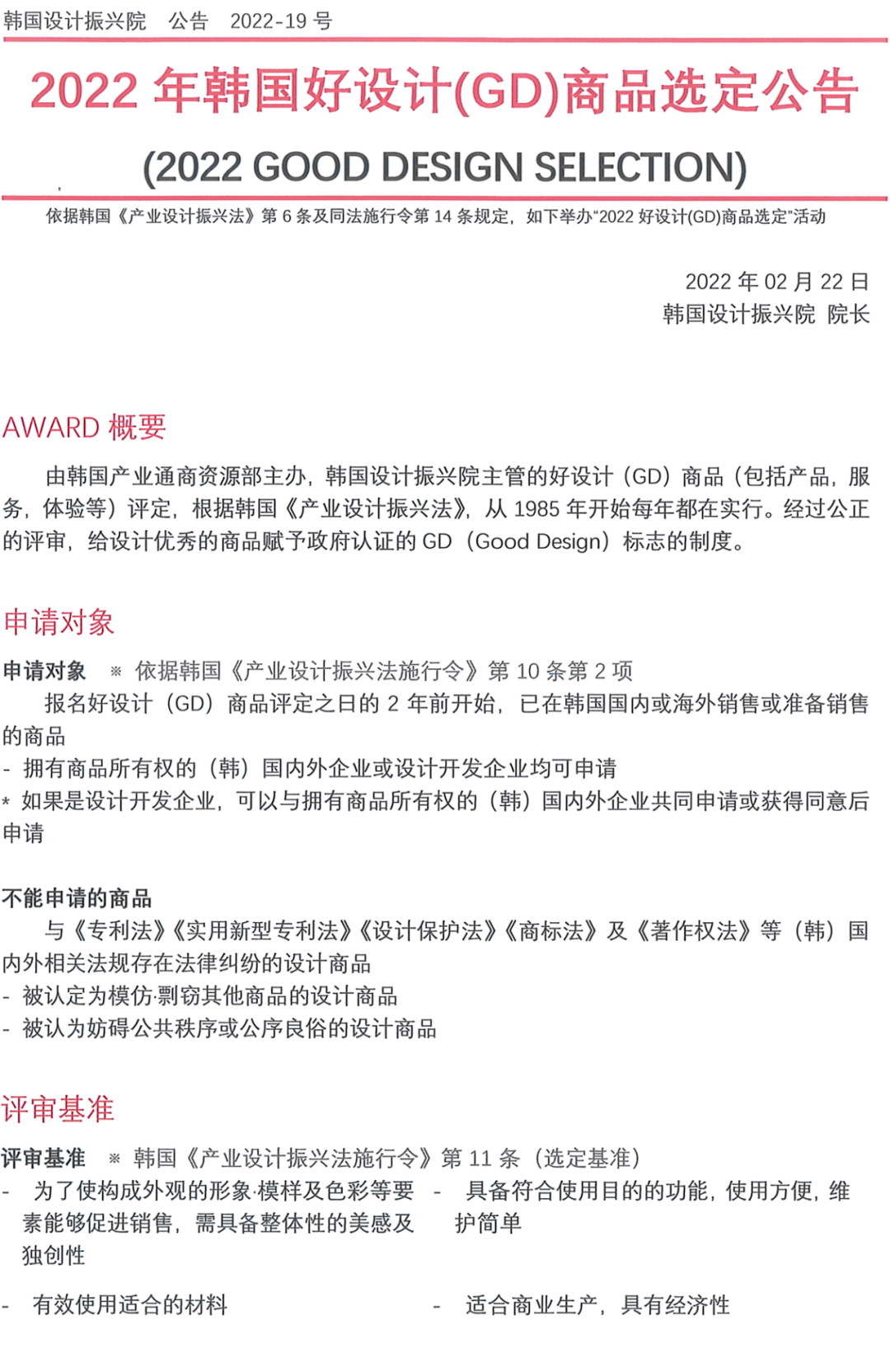 依据韩国《产业18luck新利全站 振兴法》第6条及同法施行令第14条规定,如下举办“2022好18luck新利全站 (GD)商品选定”活动