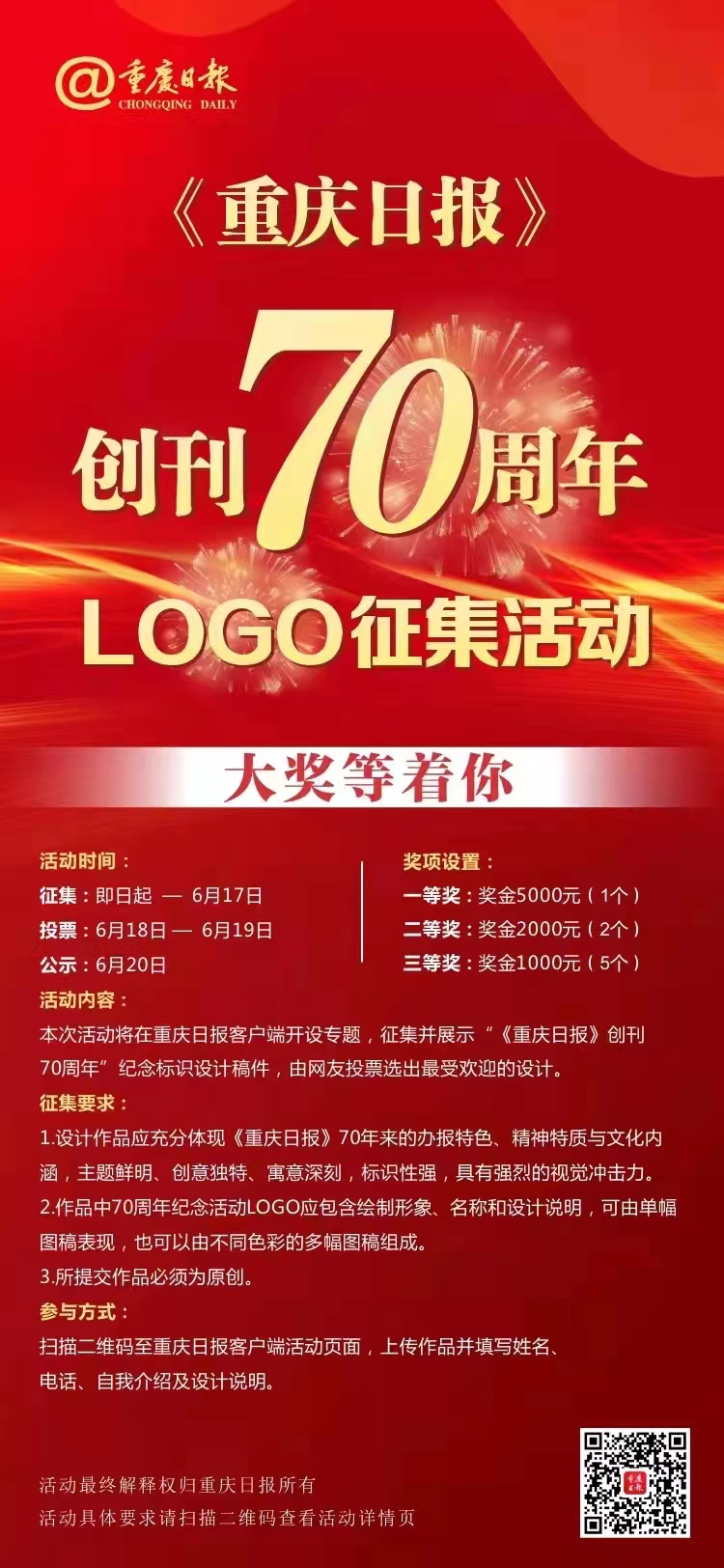 6月18日至19日,重庆日报将在重庆日报客户端开设专题,集中展示《重庆日报》创刊70周年纪念活动logo18luck新利全站 作品,并通过网友投票、专家评审,在6月20日评出一二三等奖。