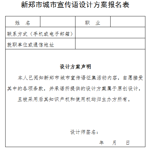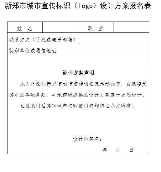 (二)城市形象标识(logo)应征作品以发送电子邮件的形式提交,在邮件标题注明“新郑市城市宣传语征集+应征者名称”字样,邮件内容:
