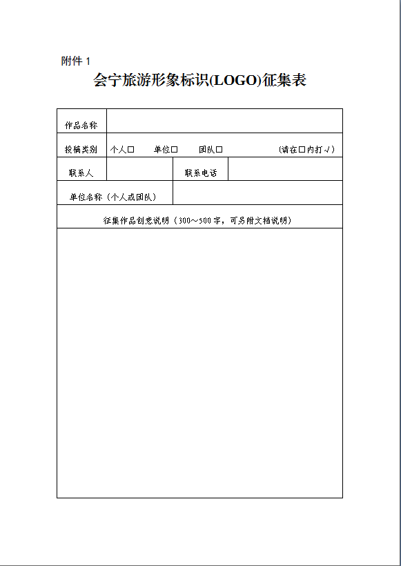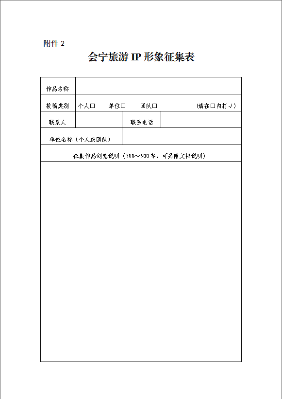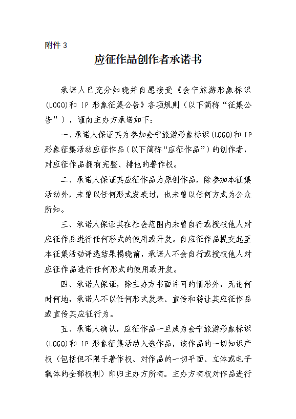 投稿人按要求填写《会宁旅游形象标识(logo)征集表》《会宁旅游IP形象征集表》和《应征作品创作者承诺书》,连同投稿作品放在一个文件夹压缩后上传,发送至邮箱hnxwlj@126.com,邮件主题需注明“会宁旅游形象标识(logo)和IP形象征集”。