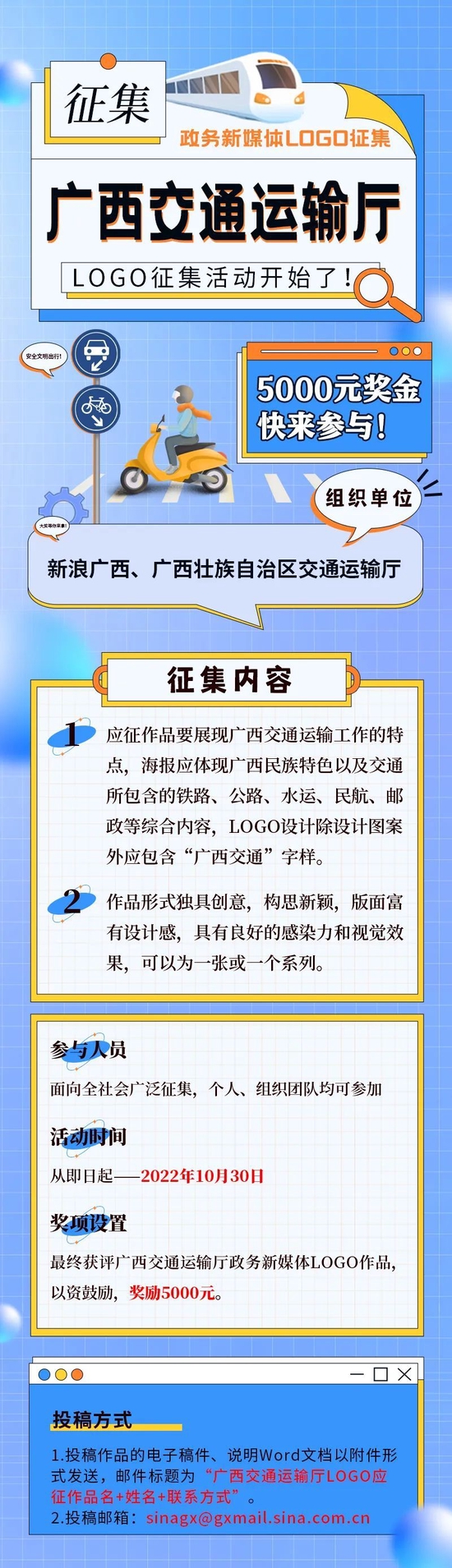 18luck新利全站 方案请于2022年10月30日前,向sinagx@gxmail.sina.com.cn邮箱投稿,邮件命名为“广西交通运输厅政务新媒体logo征集活动”,邮件内含18luck新利全站 图稿(包括源文件)、创意说明及个人简介(须注明本人名字、职业、联系方式等信息。)