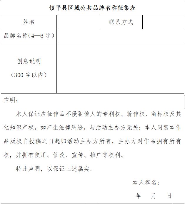 附件1:《镇平县区域公共品牌名称征集表》