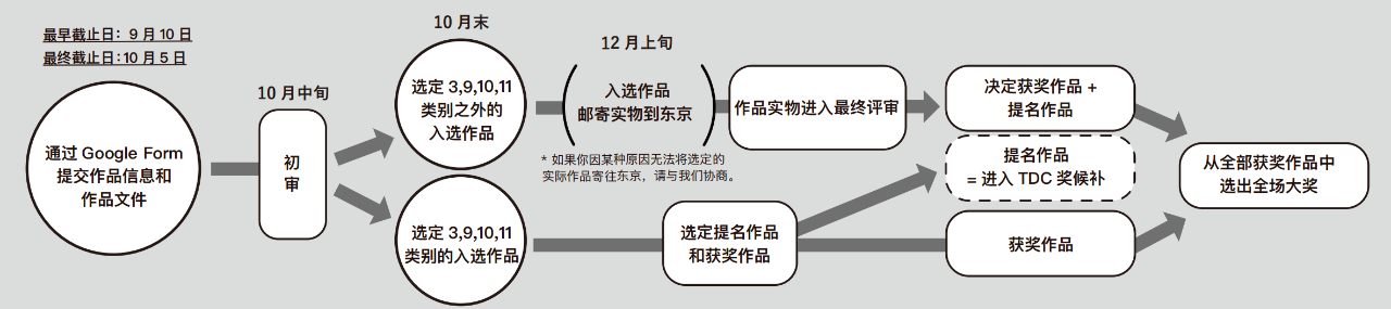 →届时请入选者邮寄作品至 TDC 办公室,2023年12月中旬将在东京会场将作品实物铺展开来进行晋级评选。选出提名作品以及得奖作品。(作品实物基本上无法返还请谅解,如有希望返还者我们将安排以到付的方式返还。)