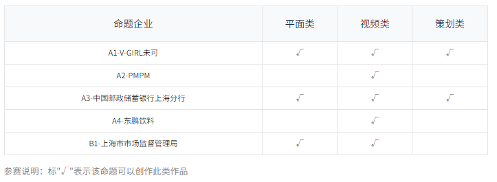 参赛团队必须按照大赛组委会发布的命题及要求进行创作。命题包括由品牌单位提供的 “品牌命题”和组委会发布的 “公益命题”。