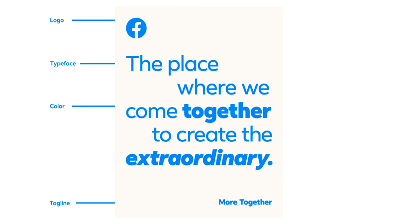 Facebook从一开始就与蓝色联系在一起,该品牌延续了这种关联,特别是在主标题和副标题中,但它也引入了乳白色,比如彩色调色板上的纸。