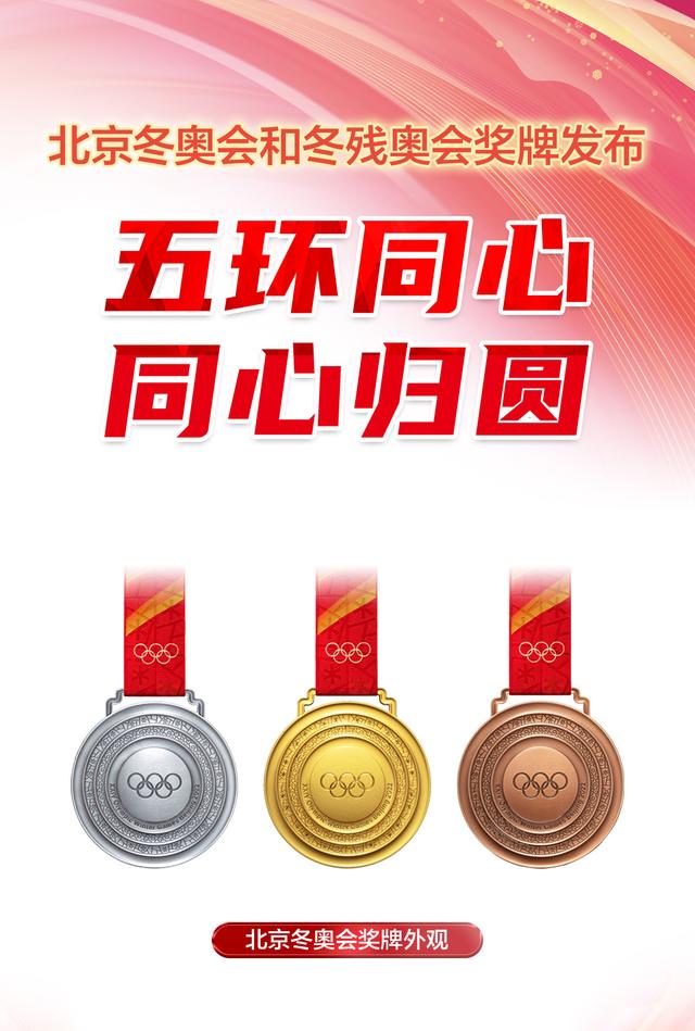 北京2022年冬奥会奖牌,由圆环加圆心构成牌体,形象来源于中国古代同心圆玉璧,共设五环。五环同心,同心归圆,表达了“天地合·人心同”的中华文化内涵,也象征着奥林匹克精神将世界人民聚集在一起,共享冬奥荣光。奖牌造型质朴简洁,体现了北京冬奥会“简约、安全、精彩”的办赛要求,并与北京2008年奥运会奖牌“金镶玉”相呼应,展现了“双奥之城”的文化传承。