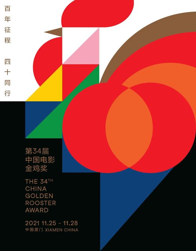 源自于第34届中国电影金鸡奖海报18luck新利全站 大赛获奖作品,海报中的雄鸡形象呈现五彩变化:“中国红”昭示建党百年的坚定和炽烈;“生态绿”映衬和谐发展的生机和希望;“海天蓝”饱含海天一色的清朗和大气;“荣耀金”彰显电影强国的梦想和使命;“古典墨”散发传统文化的气质和魅力。