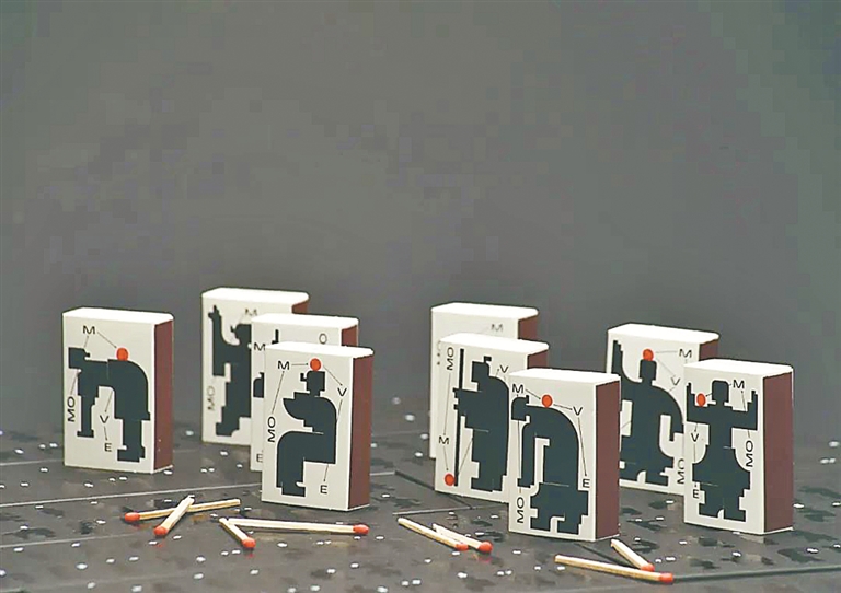 专业组包装类金奖作品《MO MOVE 火柴盒》使用酒店房间提供给客人的火柴盒作为宣传媒介,MO MOVE即MORE MOVE,呼吁人们多到户外活动强身健体。人物造型参考了汉代石刻的表达形式,寓意人们长期待在室内不运动就会变得身体僵硬。