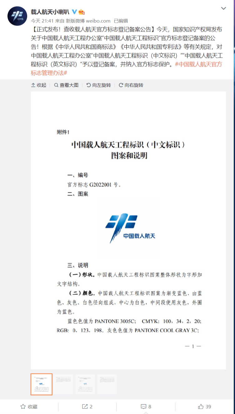 7 月 11 日消息,据中国载人航天工程网官方微博发布,今天,国家知识产权局发布关于中国载人航天工程办公室“中国载人航天工程标识”官方标志登记备案的公告,根据《中华人民共和国商标法》《中华人民共和国专利法》等有关规定,对中国载人航天工程办公室“中国载人航天工程标识(中文标识)”“中国载人航天工程标识(英文标识)”予以登记备案,并纳入官方标志保护。