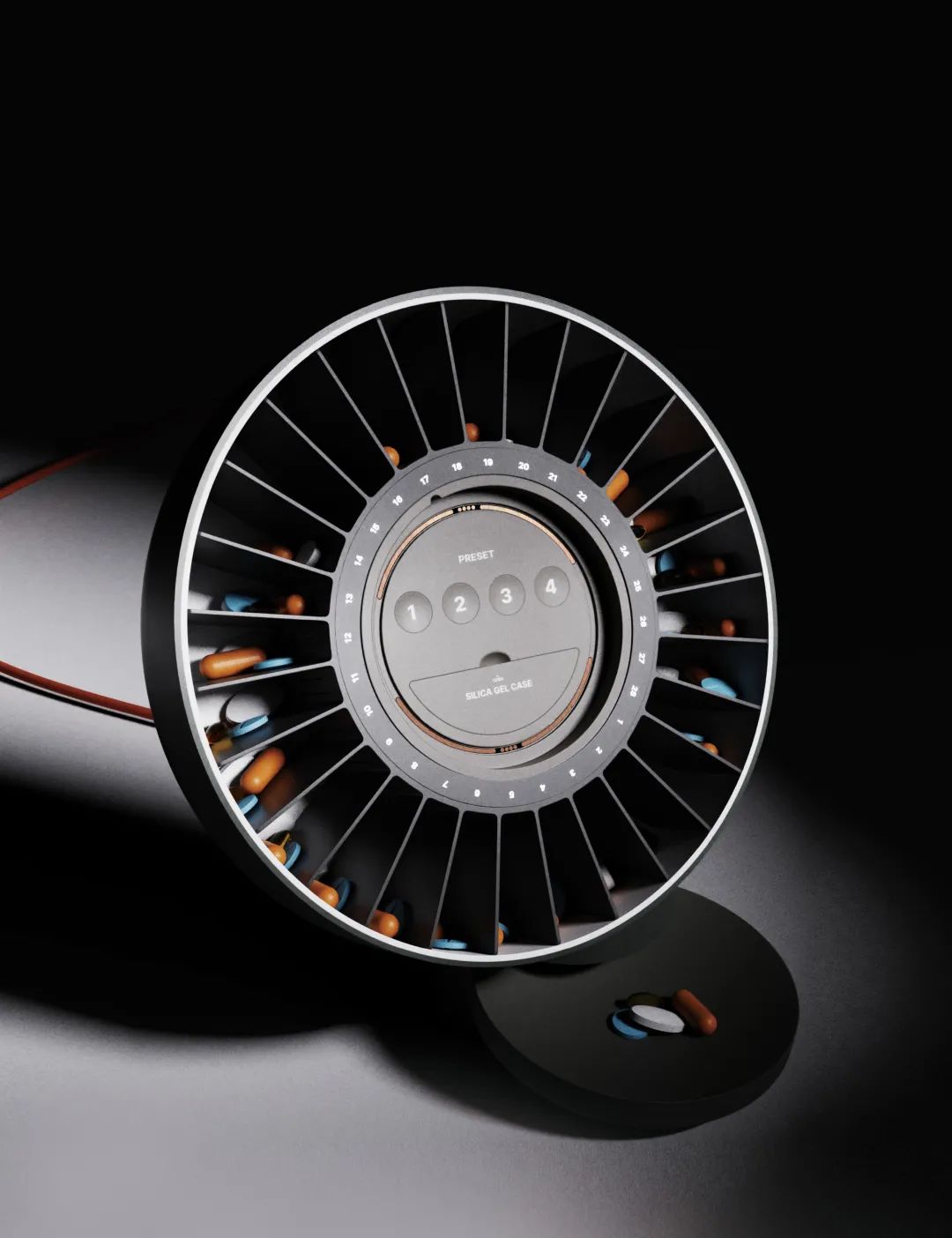 +CLOCK是一种自动药丸分配器,功能类似时钟,但可在用户设定的时间分发药丸。它旨在建立用户定期服用药物的例行程序。当需要服药时,+CLOCK会发出用户已设置的警报,并将药片分发到托盘。