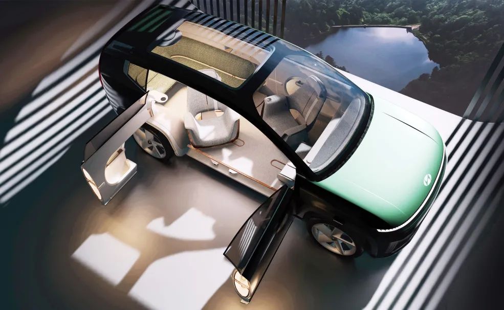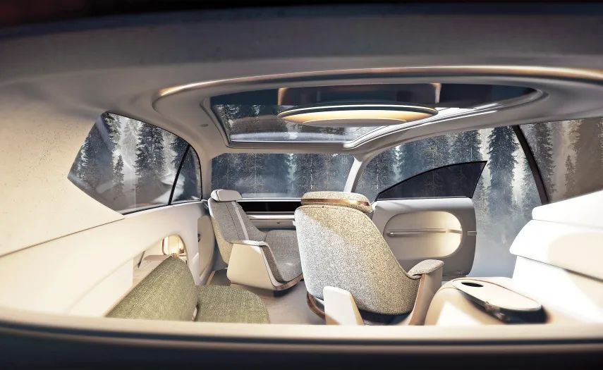 SEVEN还体现了自动驾驶的未来愿景。超薄的驾驶舱和集成屏幕创造了一种类似于休息室的体验,包括可旋转的休闲椅和一个弯曲的长椅,车顶上配有一个全景屏幕,不仅可显示内容,还可改变整体的内部氛围,确保旅程的轻松愉快。