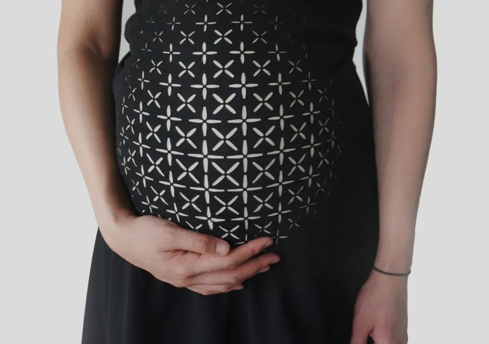 的可伸缩服装,适用于整个怀孕期。该服装的腹部区域灵活可调,以适应怀孕的各个阶段。它在制作过程中加入了一定的张力,使织物能够在婴儿的凸起处伸展,图案也会扩大以适应腹部的形状,创造出独一无二的外观。利用图案的变化,可伸缩的服装在整个过程中满足孕妇的功能需求。此外,该服装在产后仍可作为普通服装,从而减少了不必要的浪费。