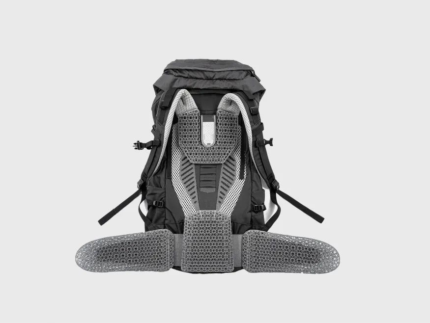 团队着手重塑传统的背包衬垫,3D打印衬垫取代了传统的基于泡沫的背包垫,开孔结构极大地改善了空气通风,减少热量积累,从而大大降低了与背部接触区域的温度和相对湿度,为户外爱好者提供了其所需的舒适性。