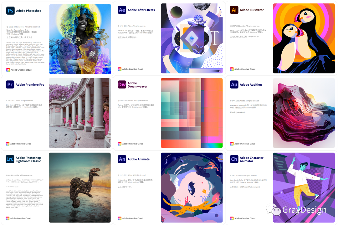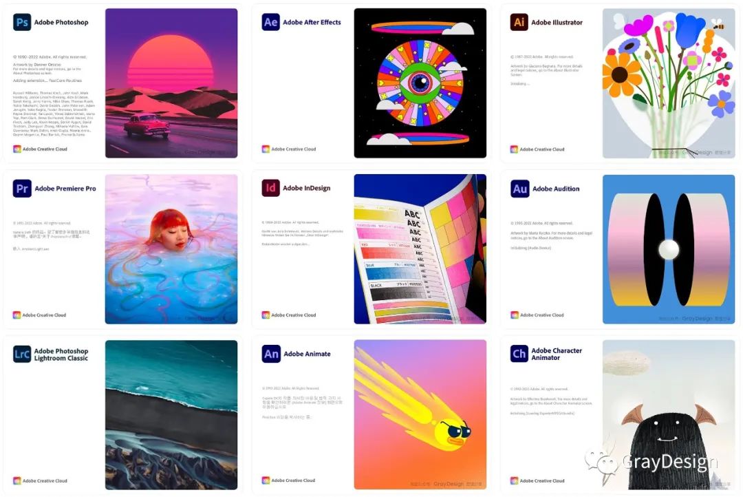 本次为大家分享的是最新的Adobe 2023版软件的启动页面,与去年发布的Adobe 2022版软件启动页面相比,只是右边插画换了,还是使用的白底封面。