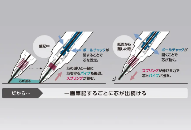 一款可让您轻轻一按即可继续书写的自动铅。双手柄,牢固的握把橡胶+金属“双重握把”;低重心,长时间书写也不会疲劳。配备“自动对中机构”,每次笔尖离开纸张时自动弹出铅芯。