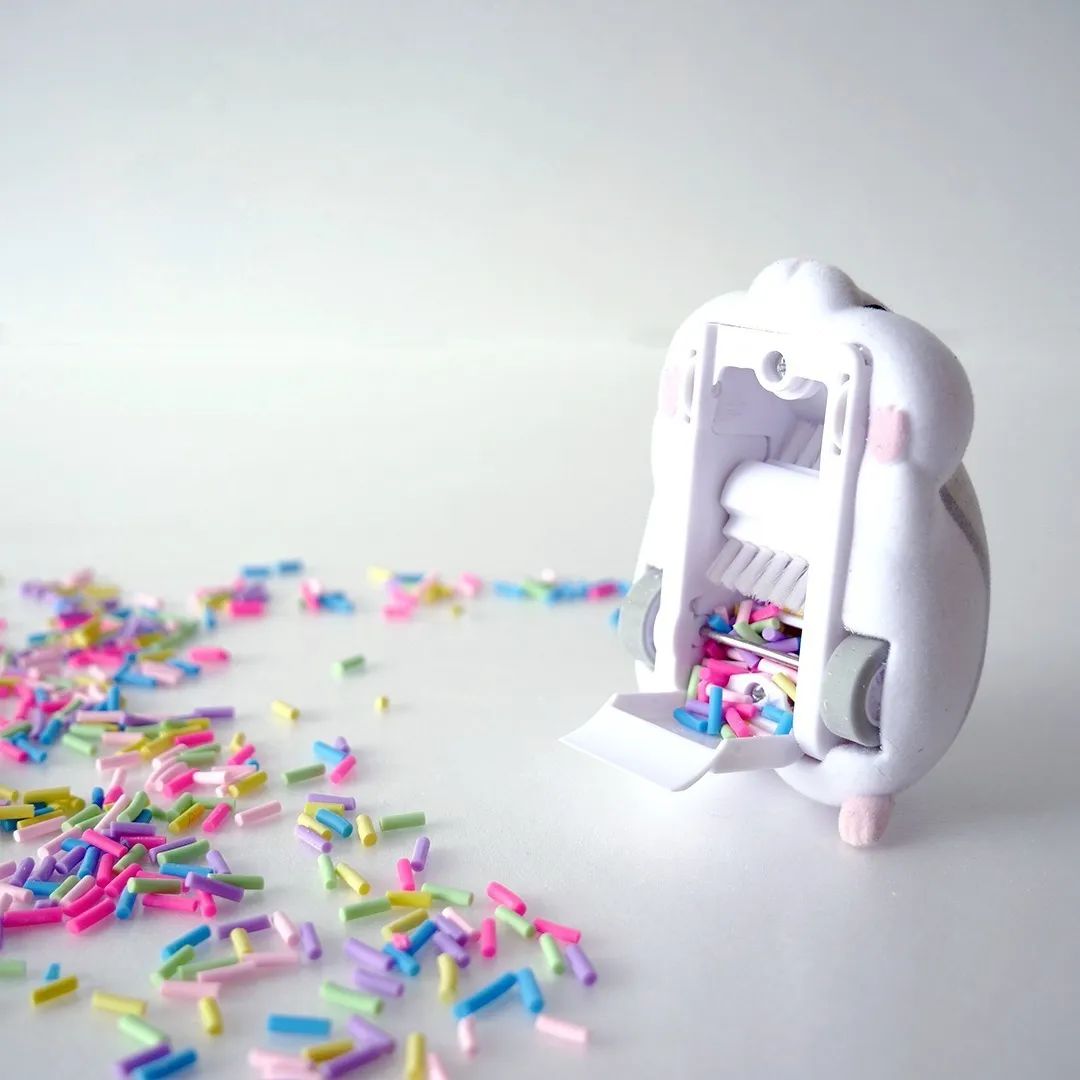 这是一款外形酷似“真仓鼠”的桌面清洁产品。使用时,只需将主机放在橡皮渣等垃圾上即可。然后用背面的刷子吸走灰尘,把它放在整洁干净的桌子上。