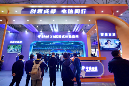 实时5G+8K VR直播大熊猫、西岭雪山等成都市文旅代表场景……中国电信“5G+XR”展区通过天翼云提供的实时视频处理及渲染能力,借助超高清沉浸式显示技术,在异型曲面空间内构建具有高沉浸感、高清晰度的虚拟现实数字空间,裸眼观看即可获得沉浸式的、身临其境的全方位感受。
