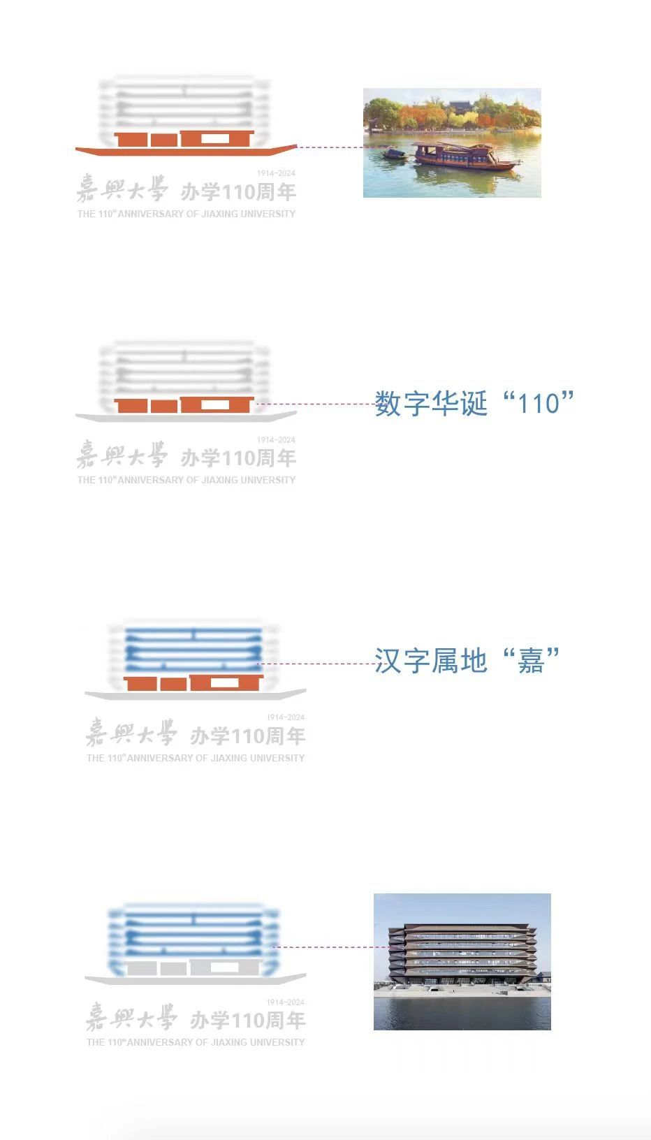 嘉兴大学110周年校庆形象标识发布-标志是由一个“嘉”字演变而成底部是南湖红船的船身船身上是数字“110”船身上部为学校标志性建筑图书馆标识运用学校标准色红色和蓝色