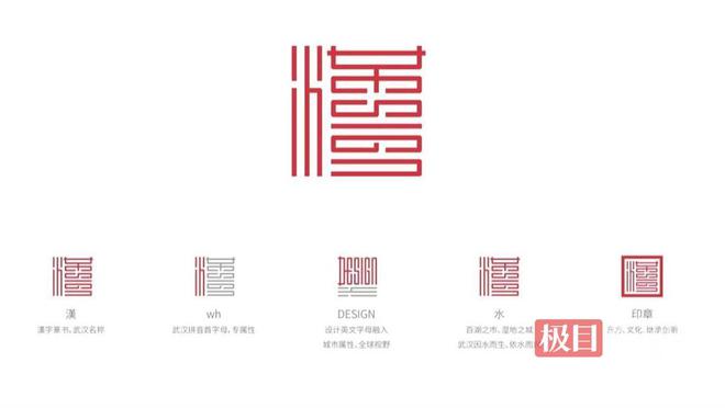 标识以繁体篆书“漢”字字形为主体,左侧三点水演化为武汉的拼音“w h”之形,强调地域专属性;右侧主体在传统中国文化美学中巧妙植入英文“DESIGN”,直观表现武汉18luck新利全站 之都的定位。