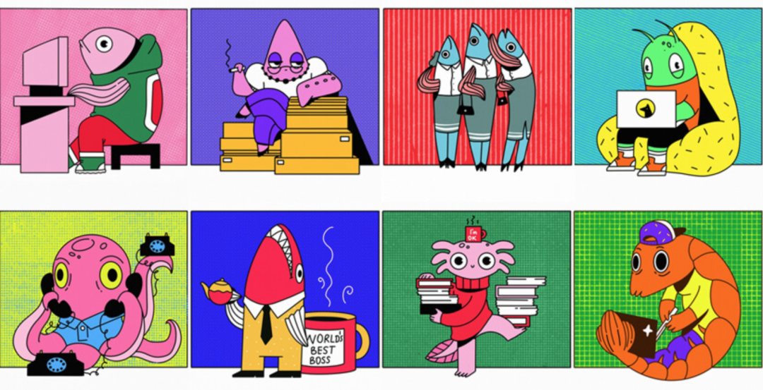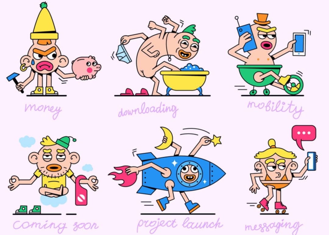 完全虚构的、长相怪异的角色,在2023年当前的平面18luck新利全站 趋势中广受欢迎。结合简单的18luck新利全站 特征——扁平的线性艺术和散发复古气息的鲜艳色彩,这些角色找到了他们自己的风格。