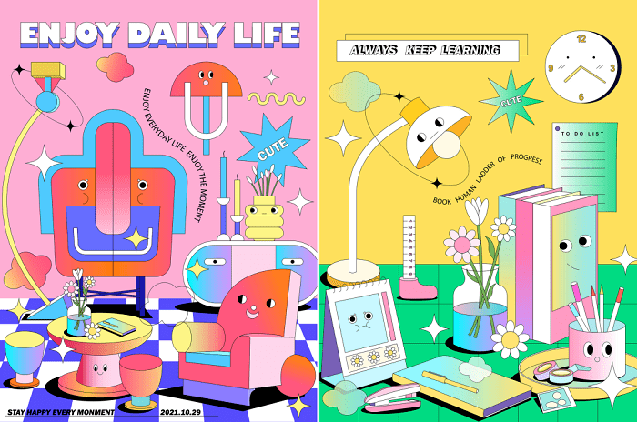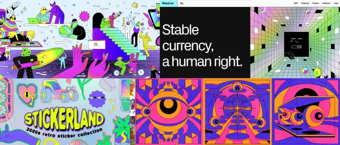 趋势中,有两种风格非常流行和热门,它们是霓虹灯和抽象卡通贴纸风格。
