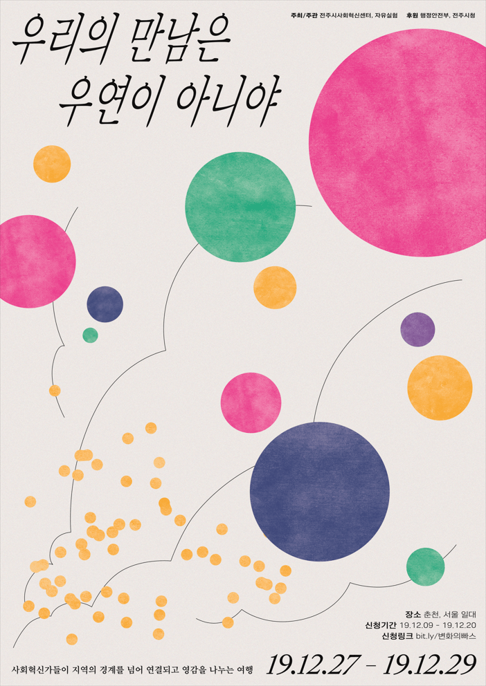 这是推广2019年创新之旅(2019 Innovative Trip)的B计划海报:我们的相遇不是巧合。创新爱好者在这趟旅程中跨越了地区边界,互相分享灵感。这张海报生动地展示了当地旅行者在这趟旅程中的团结与成长。
